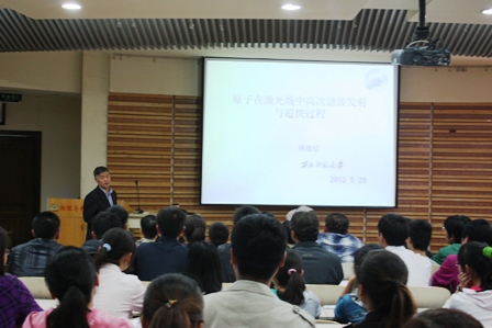 2012年5月24日下午,公司周效信教授、段文山教授和洪学仁副教授在教学9号楼A409分别作了题为“原子在激光场中高次谐波发射与超快过程”、“ 非线性物理概述及研究”和“超强超短激光与固体靶相互作用加速离子的研究”的首场学术报告。报告会由公司副经理薛具奎教授主持,大约有200多名师生参加了报告会。