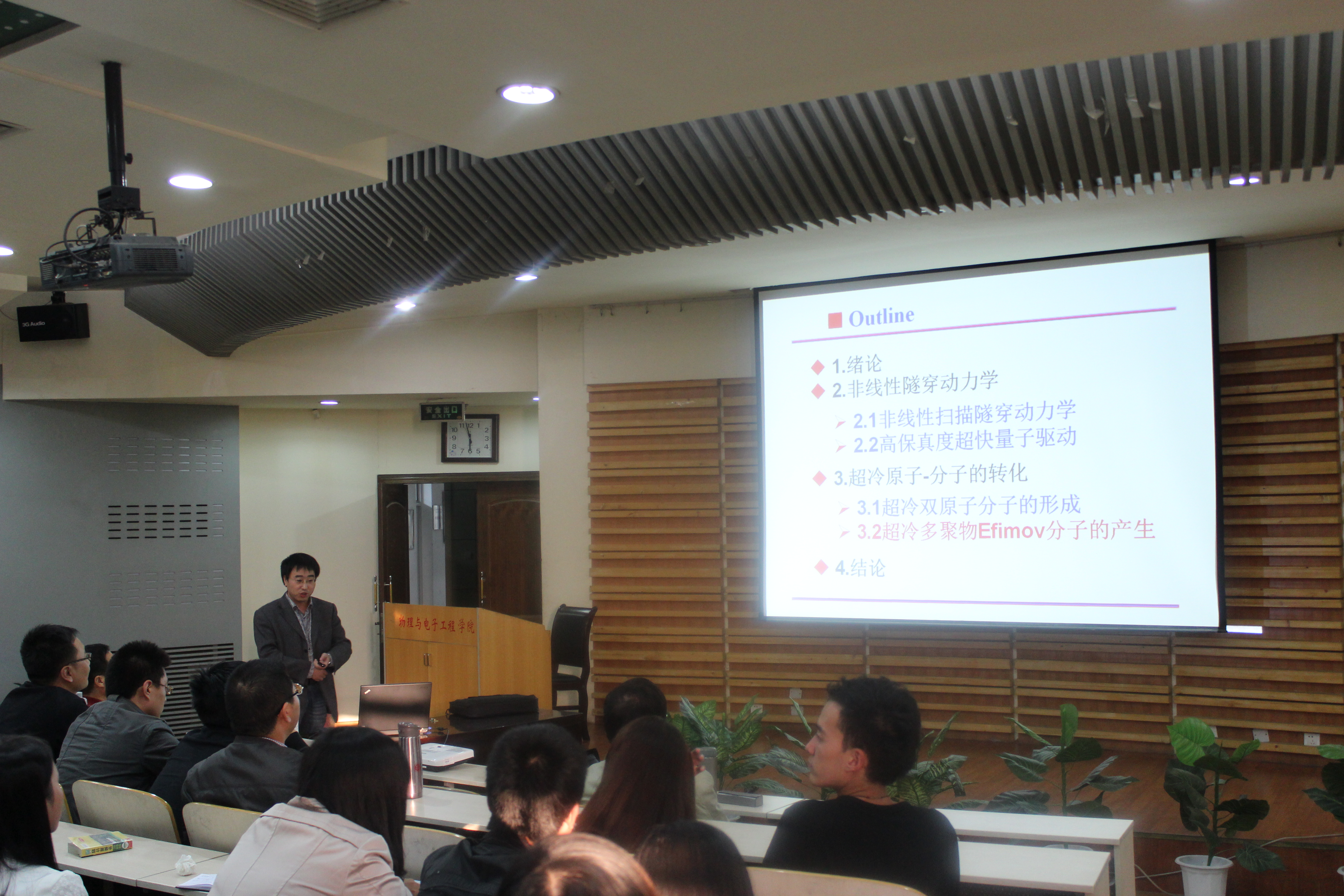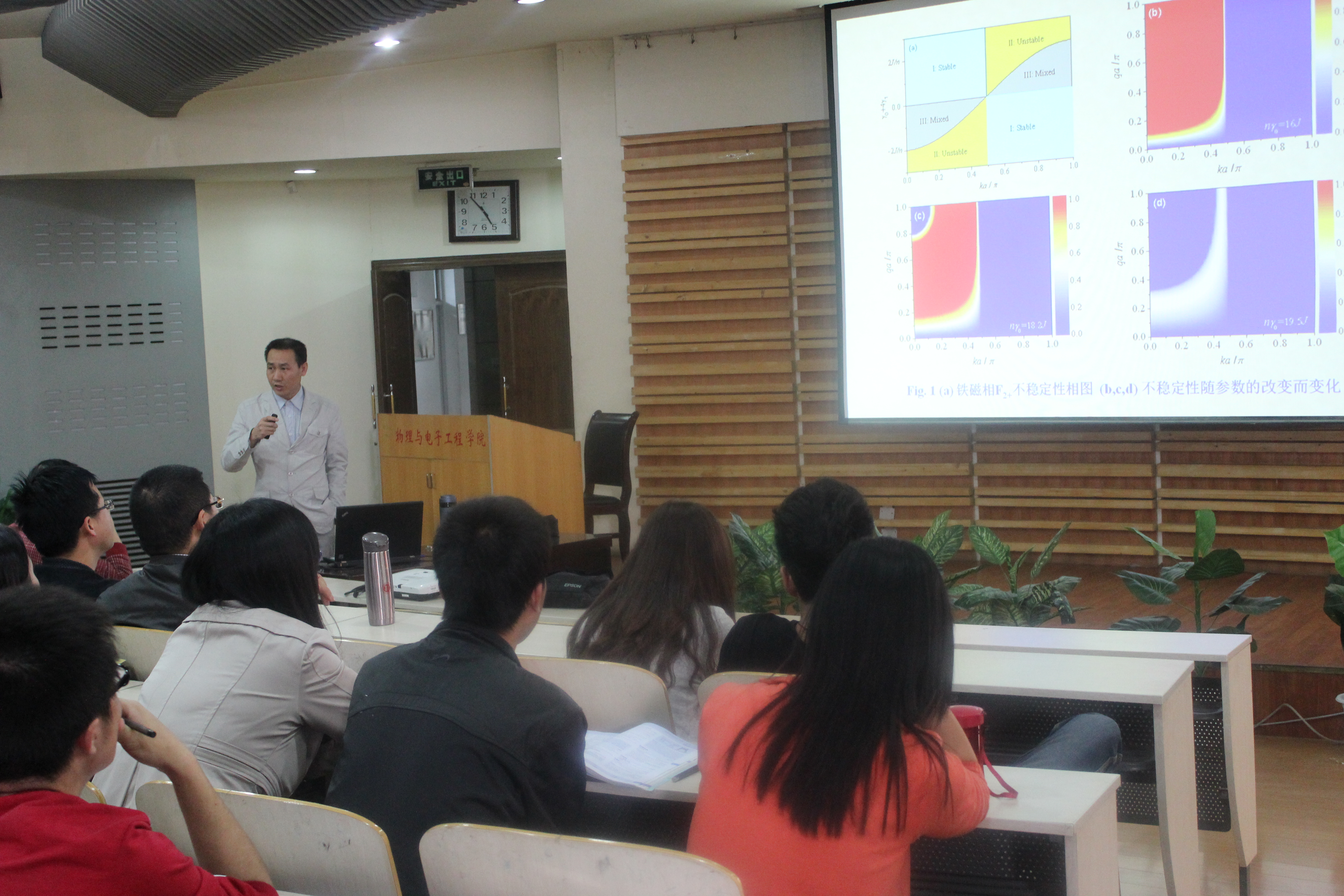 9月28日下午,公司在教学9号楼A409多功能报告厅召开了本学期首场教师系列学术报告会。报告会上,公司石玉仁教授、李燕副教授以及豆福全博士分别做了题为《光晶格中Spin-2 BEC的动力学不稳定性研究》、《新型光电极材料的设计制备及其在染料敏化太阳能电池中的应用》与《超冷原子系统中非线性隧穿及其原子-分子转化的量子操控》的学术报告,并与师生就相关问题进行了热烈讨论。报告会由bevictor伟德副经理、博士生导师薛具奎教授主持。公司部分老师、研究生及本科生共200余人参加了报告会。