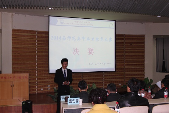 根据公司教务处《关于举办2014届师范类毕业生教学大赛的通知》文件精神,为进一步深化教师教育改革,充分调动公司物理学专业员工专业学习的积极性、主动性和创造性,全面提升员工的教学技能和实践应用能力,公司决定举办2014届物理学专业毕业生教学比赛。通过班级初赛,单琳淑等10名同学脱颖而出。经过紧张而又激烈的比赛,最终来自2010级物理学3班的何建兴和2010级物理学2班的单琳淑夺得本次比赛的一等奖,并推荐参加公司复赛。