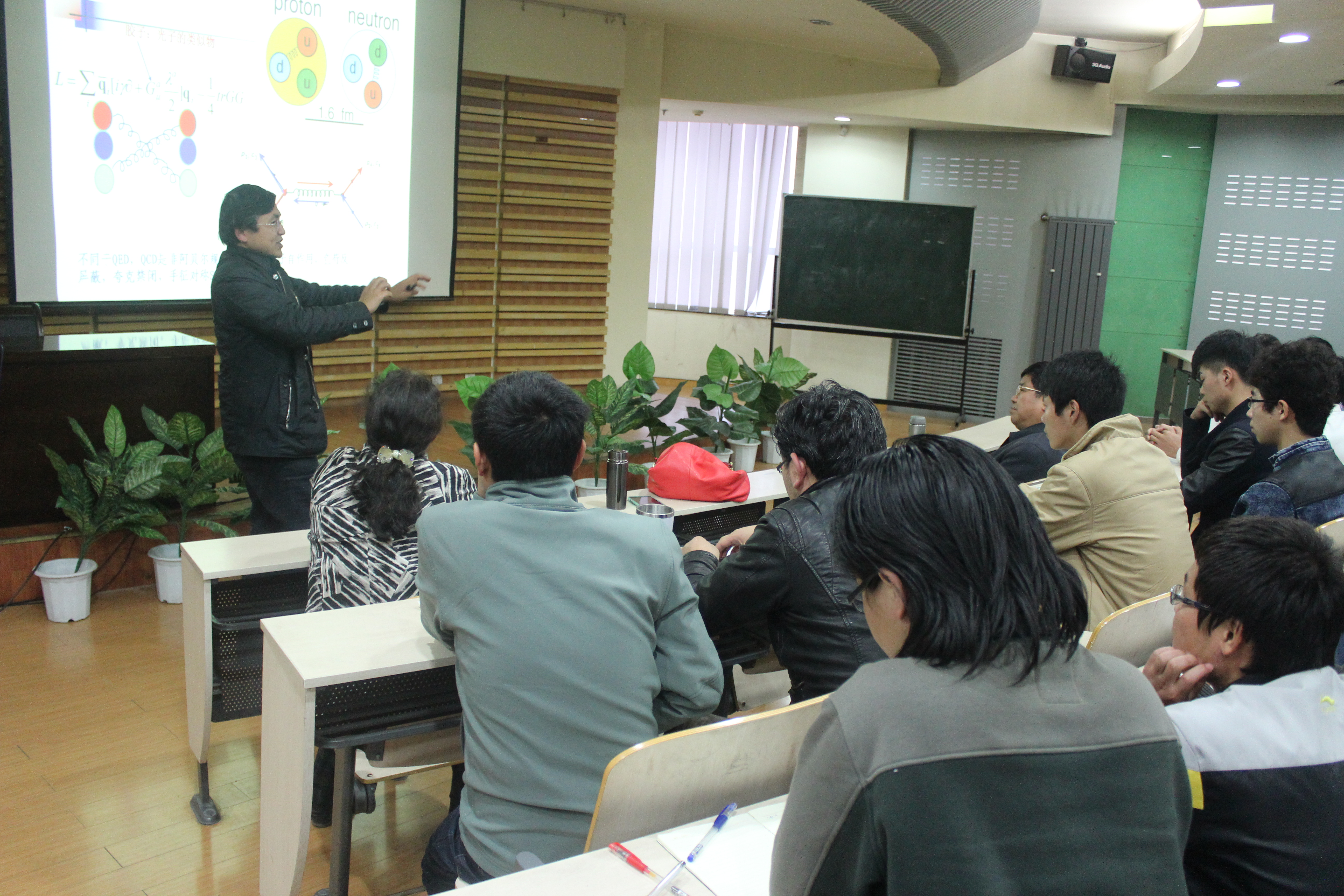 贾多杰教授通过简要回顾原子核和核力的量子模型的建立过程,介绍了核力在强子层次的基本特征和夸克胶子层次的理论构建,讨论了当前人们如何从量子色动力学(QCD)出发来探索核力的性质和如何由夸克胶子理解强子的构成,引起在座师生的热烈讨论。蒋军副教授以原子在外电场中的极化为背景,对原子态的极化率进行了详细的讲解,并报告了对原子态极化率、Tune-out波长和Magic波长进行的计算,探讨了这些参数在实验研究中的重要作用,并与师生就一些具体问题进行了讨论。