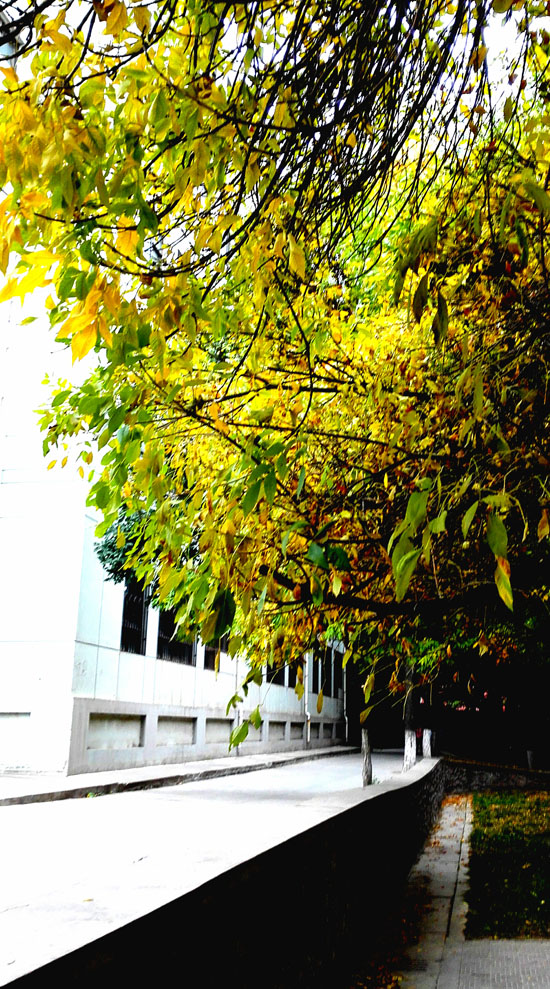 一片片灿烂枯黄的叶子,依恋的摇曳在枝头,如一只只将要翩翩起舞的蝴蝶,在傍晚辽远的长空中划出优美的弧线,映衬着深秋独有的天高气爽。西师校园,伴着树下书页的悄声言语,秋的气息愈发浓厚。