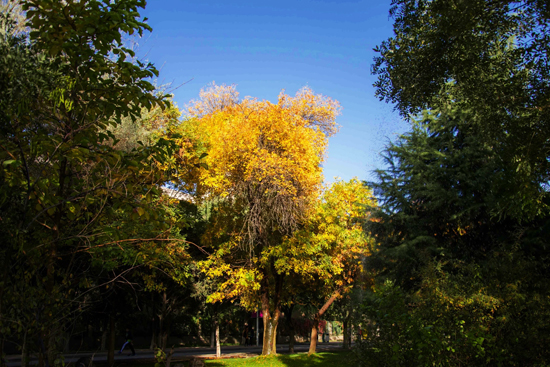 柔软苍翠的草地,湛蓝泛碧的晴空。一树金黄,在秋日明媚的阳光里肆意起舞。停落在枝头的啁啾小鸟,将秋的讯息欢乐地传达,秋的蜜意弥漫在校园之中。