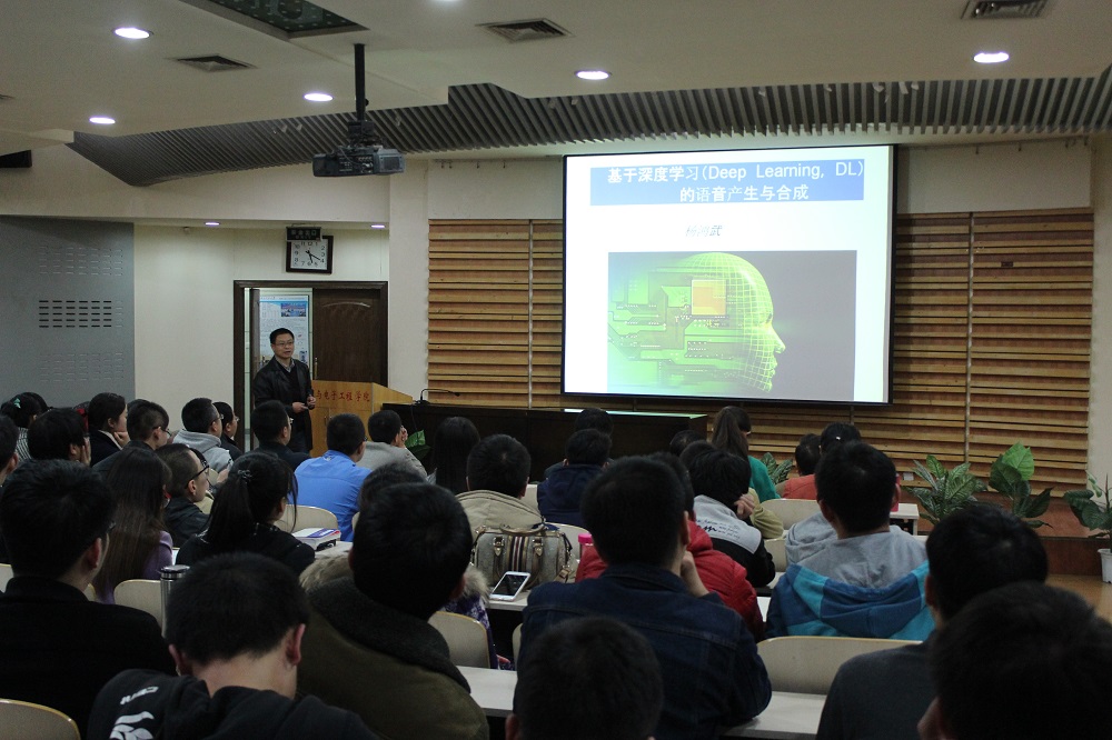 杨鸿武教授从深度学习算法的历史发展讲起,详细介绍了深度学习算法的基本思想及其相对其它相关算法的优越性,分析了深度学习在语音识别中的成功应用,着重探讨了深度学习在语音产生与合成中的应用与实现,最后对深度学习算法的发展趋势作了展望,报告引起了在座师生的广泛兴趣。