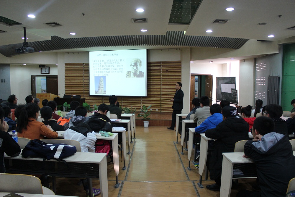 孙艳军副教授从物质的构成角度介绍了高能物理的研究范围,接着通过欧洲大型强子对撞机(LHC)的视频短片详细讲解了加速器和高能粒子碰撞实验的基本原理和高能物理研究的基本方法,接着讲解了夸克模型的起源、各代夸克的发现历史,然后简单介绍了夸克理论-量子色动力学,最后介绍了目前多夸克态粒子的实验结果和理论拟合模型。报告引起了在座师生的广泛兴趣。
