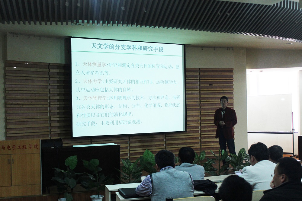 符彦飙教授首先介绍了公司天文台的建设历史和运行情况,然后介绍了天文学的分支学科和研究手段,讲述了国内外古天文学取得的辉煌成就,概述了目前我们认知的宇宙模型,接着详细介绍了天文望远镜的发展历史和工作原理,最后介绍了其指导的公司天文爱好者协会的基本情况,并由闫强同学展示了天文爱好者协会利用天文台望远镜所取得的一些天文观测结果。报告引起了在座师生的广泛兴趣。