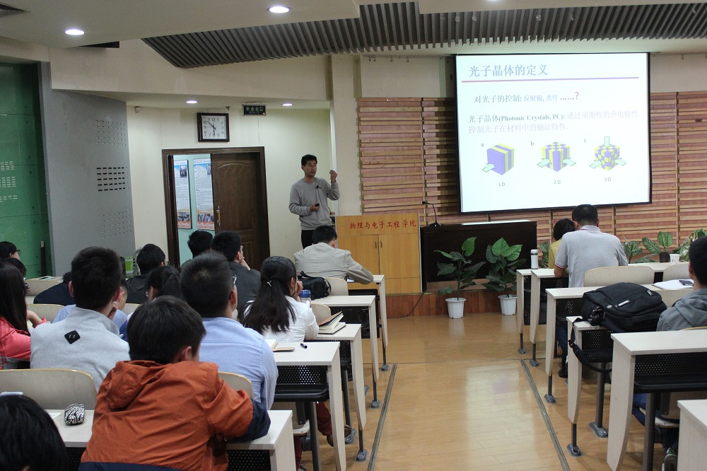 王建副教授介绍了光子晶体概念的提出和定义,讲解了光子晶体的光子带隙、光子局域和控制自发辐射特性和涉及的物理问题,以及在滤波器、慢光、光开关等方面的广泛应用,详细介绍了光子晶体的制备方法,最后介绍了自己研究小组利用阳极氧化法制备光子晶体,并在全方向器件、传感器以及光致发光增强等方面的应用研究工作。报告引起了在座师生的热烈讨论。