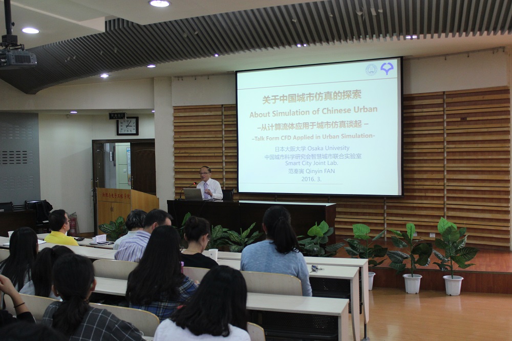 范秦寅研究员首先阐述了什么是仿真、仿真对工业的重要性以及计算流体力学仿真应用于城市仿真的意义,然后举例说明了计算流体力学在现代制造业、绿色建筑、城市规划和地球仿真等领域发挥的重要作用,最后讲解了自己团队目前所从事的关于中国城市仿真的课题。范老师的报告内容新颖,讲解生动具体,引起了在座师生的热烈讨论。