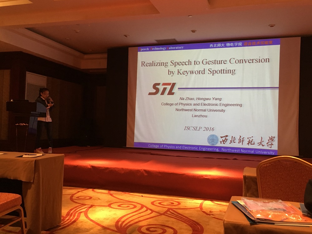 第十届中文口语语言处理国际会议(The 10th International Symposium on Chinese Spoken Language Processing,ISCSLP2016)于2016年10月17日至20日在天津大学召开,公司杨鸿武教授研究小组受邀参加了本次会议,硕士研究生赵娜作了题为“Realizing Speech to Gesture Conversion by Keyword Spotting”的口头报告,并参加了大会的“优秀员工论文交流”。
