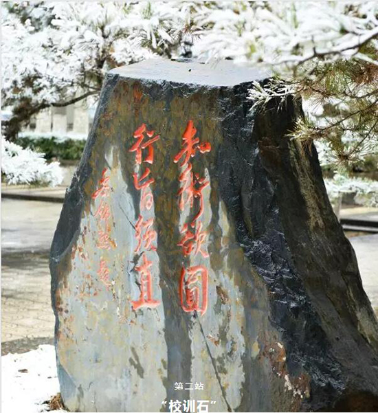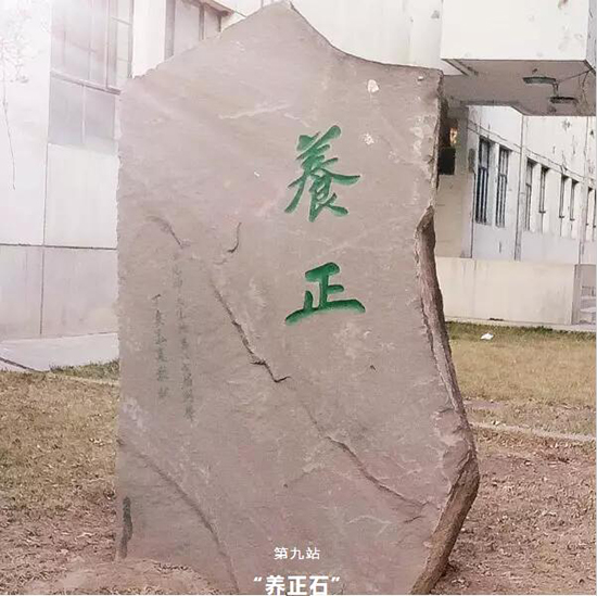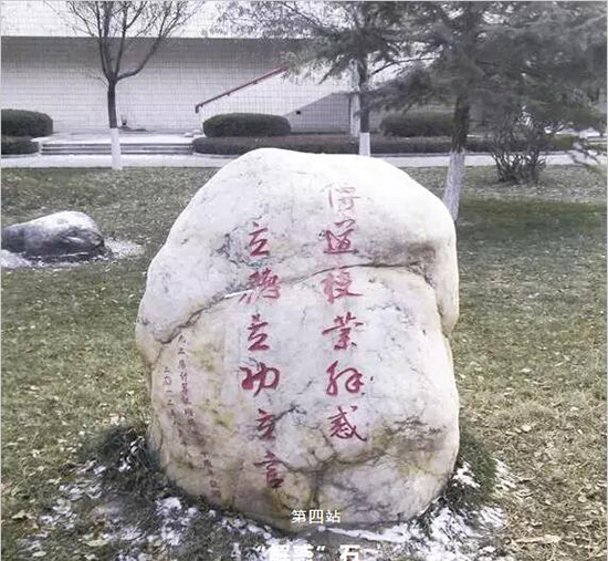 石头正面打磨光滑,刻有“传道授业解惑,立德立功立言”两行行草大字,充分展示了学子们蓬勃向上的精神活力和淳朴敦厚的治学品质,在碧绿的草坪上别有一番风味!
