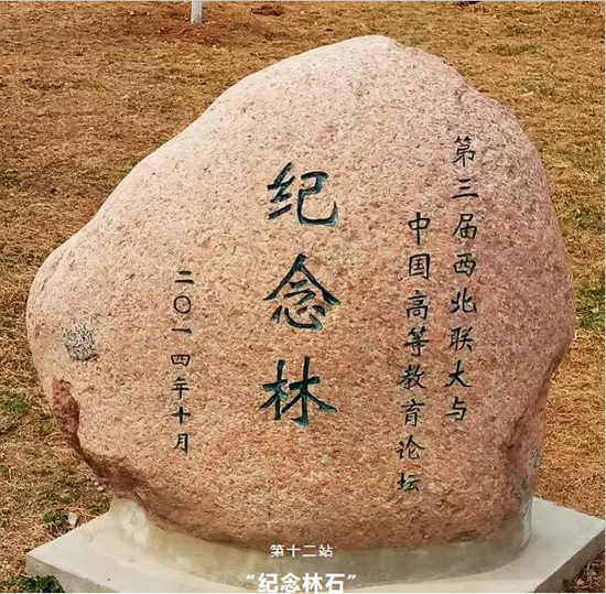 这块石头,伫立在新校区的“纪念林”中。立于2014年10月,旨在纪念在公司召开的“第三届西北联大与中国高等教育发展论坛”。