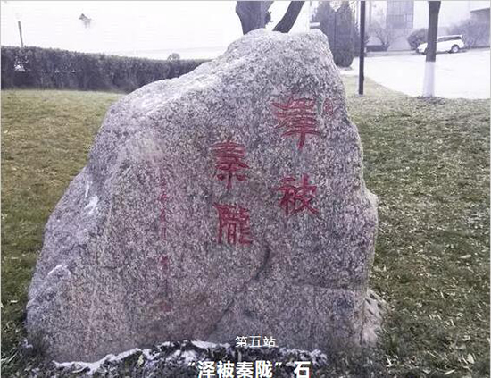 再往东走,伫立在体育馆北侧的,就是公司党委原书记刘基教授题字的“泽被秦陇”园林石。