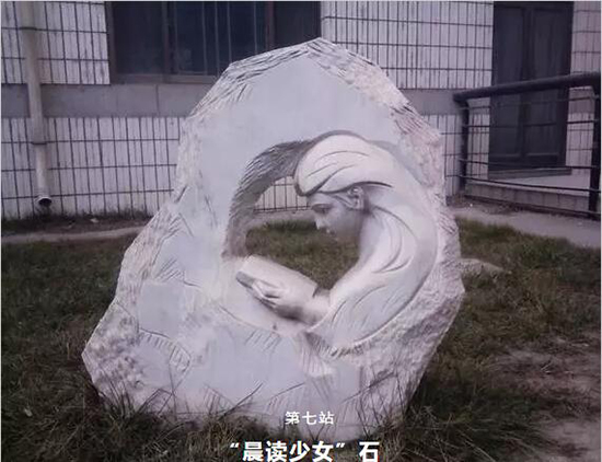 当您路过逸夫图书馆时,会看到馆后草坪中悄然伫立的“晨读少女”石。石上镌刻着一位美丽、纯真的少女,手握书卷,安静阅读。