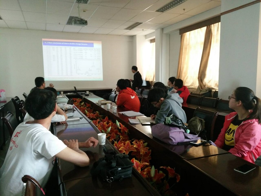 5月12日下午,应贾多杰教授邀请,安阳师范公司陈兵博士来公司为公司师生作了一场题为“粲重子质量和衰变的理论研究”的学术讲座。陈兵博士从粲重子已有的实验观测结果和最近的进展开始,强调了当前尚没有确定量子数的粲重子Lamdac(2760)和可能是奇特态的Xi(2980),接着简要地介绍了粲重子的几个主要理论模型和有效唯象理论以及这些理论模型的成功方面和局限性。最后介绍了他本人和公司兼职教授刘翔合作发表在Euro. Phys. J. C(2017)的双夸克(di-quark)模型研究成果,并对沿着该图像研究的拓展和理论工作的前景提出了自己的见解。陈兵博士还现场回答了部分教师和研究生提出的问题。