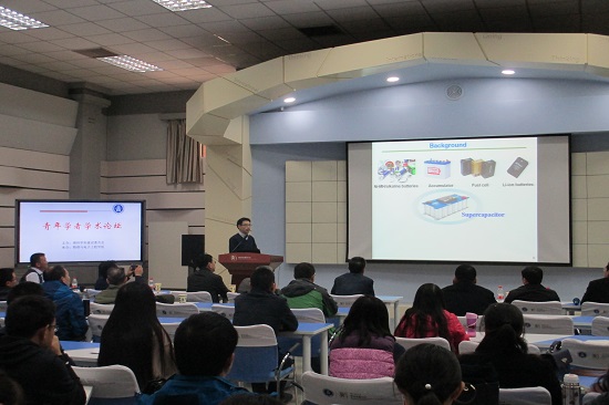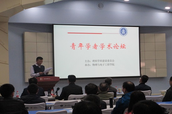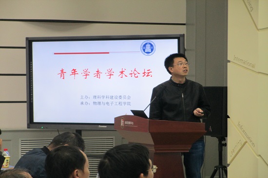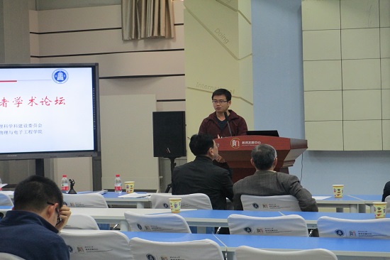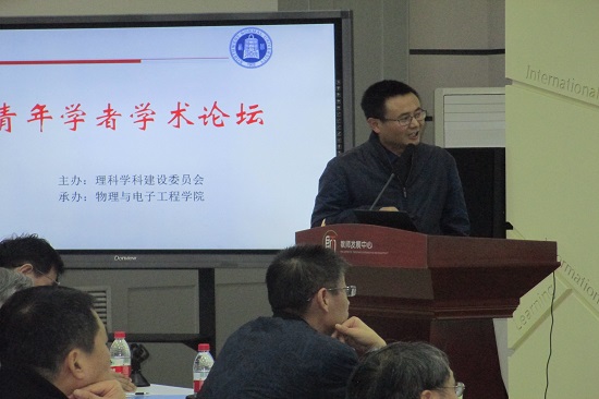 报告会上,颉录有副教授、蒋军副教授、杨和副教授、彭辉讲师和黄静伟讲师5位青年学者分别作了题为《高离化态离子结构及动力学过程的理论研究》、《原子的极化率在精密光谱中的应用》、《分数阶时滞发展方程非局部问题的可解性与可控性》、《基于二维类石墨烯纳米材料构筑新型超级电容器研究》、《复合光阳极的水氧化性能研究》的学术报告。报告中,5位学者结合报告专题,围绕各自学科背景、研究方向阐述其学术思想,介绍研究领域新进展,分享其科研历程及收获。