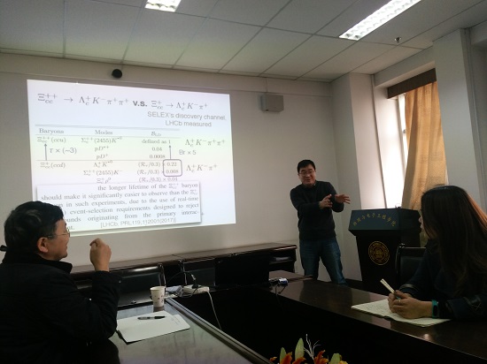 报告中,于福升副教授先从17年热门新闻双粲重子的发现出发,类比到bsubardbar和csubardbar是有可能存在的四夸克态,接着介绍了在实验上D0和CDF以及LHCb和CMS对X(5568)是否存在进行了分析。最后指出从bbarsbarud的产生和衰变原理给出证明X(5568)存在与否的途径和方法。报告期间老师和研究生就各自感兴趣的问题与于福升教授进行了讨论。