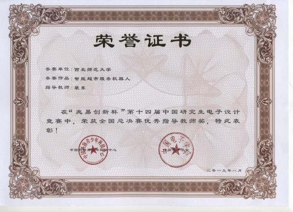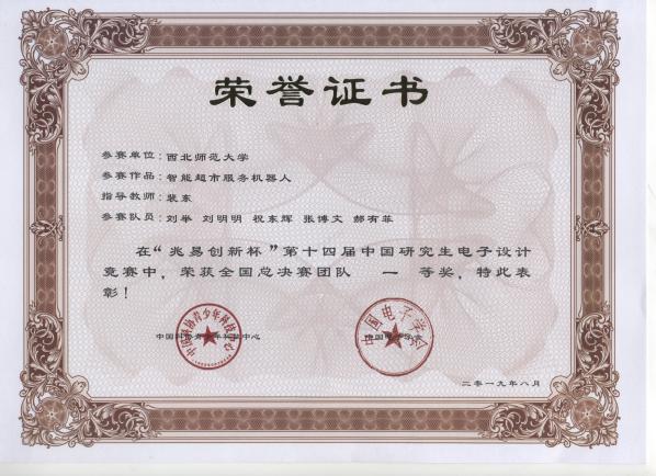 由公司裴东老师指导,刘举、刘明明、祝东辉、张博文、郝有菲等5名研究生设计制作的参赛作品“智能超市服务机器人”,经西北赛区激烈角逐晋级全国总决赛,并在全国总决赛中荣获一等奖,裴东老师获全国总决赛“优秀指导教师”奖。