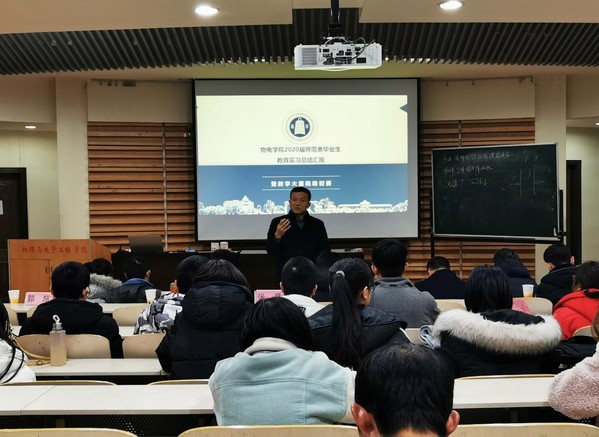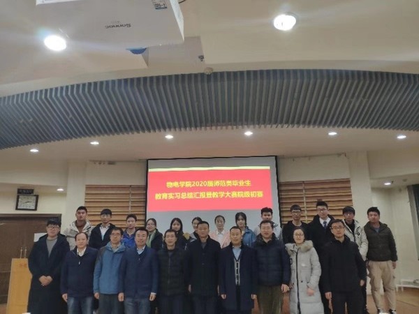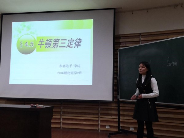 本次比赛由甘振业副经理主持,公司班子成员、物理系主任、指导教师和物理学专业毕业班班主任以及2016级物理学专业实习生共计100余人参加了本次活动。比赛中,来自不同实习点由班级推荐产生的8名优秀实习生和来自2016级本硕一体项目的5名研究生同台竞技。比赛分设实习话感想、教学模拟授课和专家点评三个环节进行,参赛者就高一物理必修教材中的自选内容提交教学设计1份,制作PPT演示稿结合黑板板书进行了演讲和模拟授课。实习同学结合三个月以来自己的亲身经历,讲述了发生在身边的实习故事,畅谈了在教育实习工作中的切身感受和收获;本硕一体生就加入该项目三个月以来自己在专业学习和教学能力提升方面的感悟与大家进行了分享。在模拟授课环节,同学们通过精心设计的课件、自制教具和丰富的实验演示以及使用现代化的多媒体教学手段,展示了教育实习和本硕一体项目训练的丰硕成果,同学们的努力获得了评委的一致认可和好评。比赛中,评委对每一位同学的表现做了细致的点评,肯定了其优点的同时,也对讲课过程中的不足和改进的方向给出了宝贵意见。选手们的精彩表现和评委的专业点评也使在场的其他同学收益匪浅。