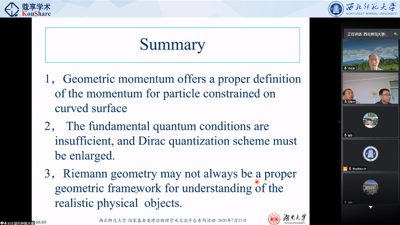 如何建立约束在弯曲曲面上粒子的量子力学很长一段时间内一直是一个难题,报告中刘全慧教授以几何动量的提出和发展为主线,综述了近十年来弯曲超面上量子力学的系列研究进展,包括几何动量的提出、量子化条件的扩展等。报告会现场氛围轻松活跃,刘全慧教授思路清晰,语言深入浅出,讲解生动有趣。报告会后刘全慧教授回答了师生关心的问题,通过线上平台也与全国各高校老师和同学进行了互动答疑。