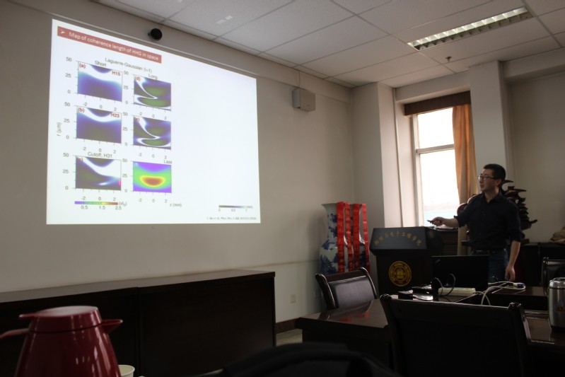 报告中,金成教授首先展示了如何利用二氧化碳分子高次谐波光谱中的极小值结构,并通过改变取向度或泵浦-探测角度来调控阿秒脉冲的波形。金成教授还介绍了利用环形光束在极端条件下产生近轴传播的高次谐波,在空间分离驱动激光与高次谐波光束,为高重复频率激光的应用提供有益的思路。最后,金成教授还报告了在涡旋飞秒激光驱动下极紫外波段内携带轨道角动量的原子高次谐波的模拟方法和相位匹配的产生机制。报告后,金成教授与师生进行了深入交流。
