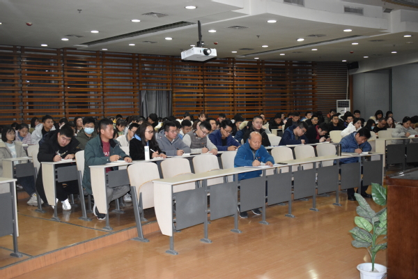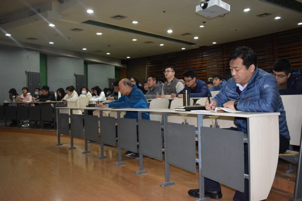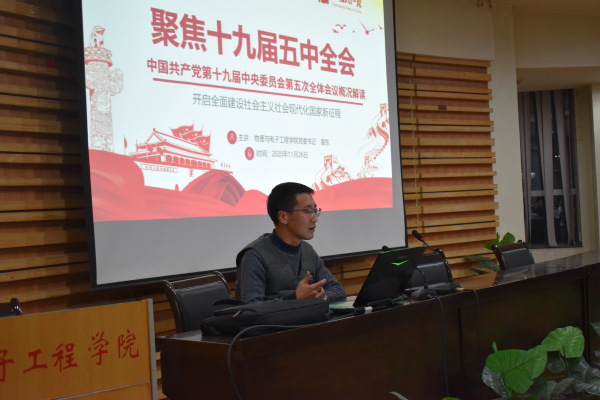 11月26日晚,在教学9号楼409会议室,召开“学习党的十九届五中全会精神”报告会,全体党员、部分师生200余人参加。会议由党委副书记高天主持,党委书记裴东主讲。