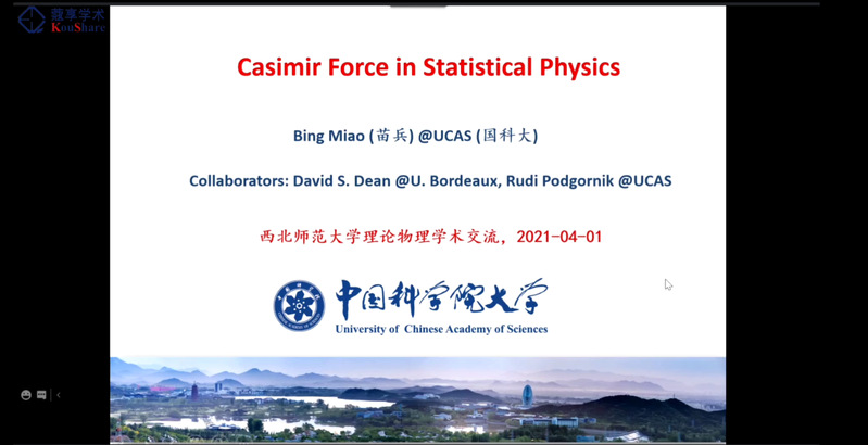 交流期间苗兵教授作了题为《Casimir Force in Statistical Physics》的学术报告,报告采用线下线上相结合的方式进行,并通过蔻享学术平台进行直播。报告中苗兵教授首先介绍了卡西米尔效应的基本概念和发展历史,紧接着详细介绍了如何利用路径积分计算卡西米尔力,最后分享了近期正在进行的工作。报告会由理论物理研究所所长豆福全主持,线下相关学科教师、研究生共40余人参加了本次报告会,当天直播在线观看人数高达1300余人。报告会现场气氛活跃,与在场师生进行了热烈的讨论与交流。通过线上平台,苗兵教授还与全国各高校老师和同学进行互动答疑。
