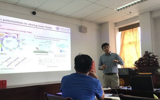 栗建兴教授报告的主要内容是强激光驱动的高能极化正负电子束和偏振伽玛射线的产生。近年来,随着强激光技术的快速发展,利用强激光脉冲在飞秒时间尺度直接产生高能、高亮度极化正负电子束和偏振伽玛射线脉冲引起了人们广泛的研究兴趣。然而,强激光场中电子自旋反转理论和非线性光子偏振理论均尚未完善。针对此问题,该课题组发展了包含粒子自旋的非线性康普顿散射和Breit-Wheeler正负电子对产生理论及蒙特卡洛算法,基于此揭示了强激光场中辐射引起的粒子自旋随机反转和信息传递机理,提出了强激光驱动的高能高亮度极化正负电子束和偏振伽玛光源的制备方法。