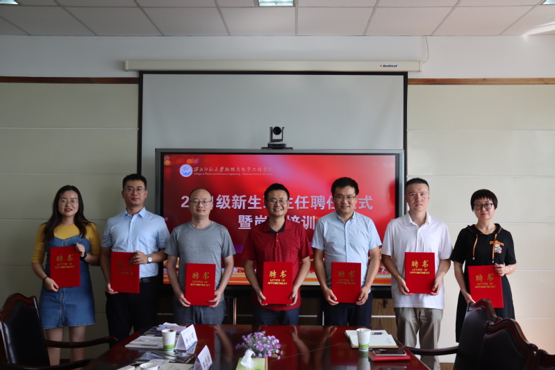 在聘任仪式上,高天代表公司宣读聘任决定,选聘蒋军等7名老师分别担任2021级物理学1班、物理学2班、物理学3班、物理学4班、电子信息工程1班、电气工程及其自动化1班、材料物理学1班班主任。
