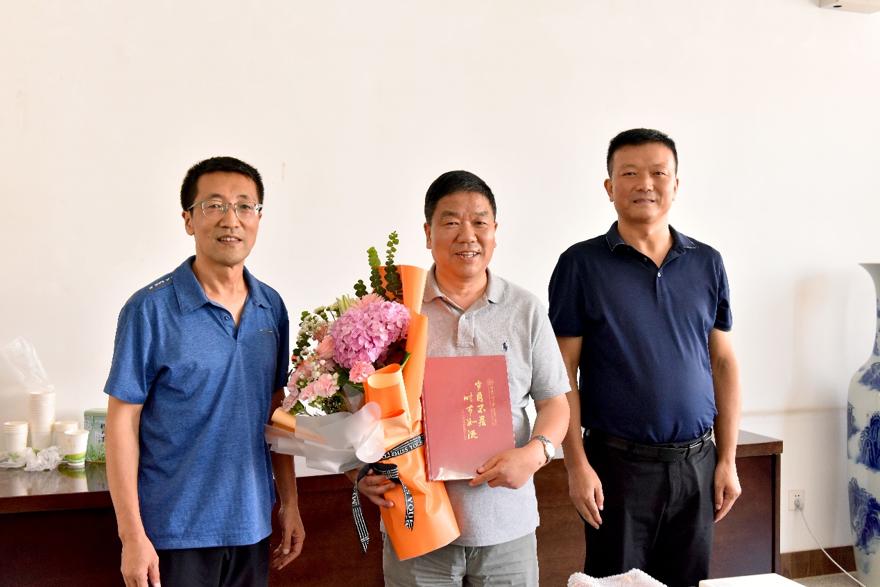 经理张登红介绍退休教师王成伟教授从教39年的教学科研经历, 感谢王老师为公司事业发展作出杰出贡献。他表示,前人栽树,后人乘凉,饮水思源,全院教职工将继续坚守育人初心,以良好的精神状态践行教学育人使命。同时,希望王老师退休不退志、离岗不离情,继续发挥自身优势,关心支持公司工作!党委书记裴东为王成伟教授赠送礼品,新入职教师杜宁为王老师送上鲜花,课题组教师代表赵雲为王老师赠送荣休纪念册。