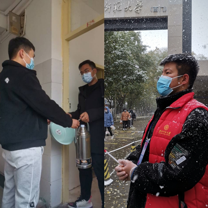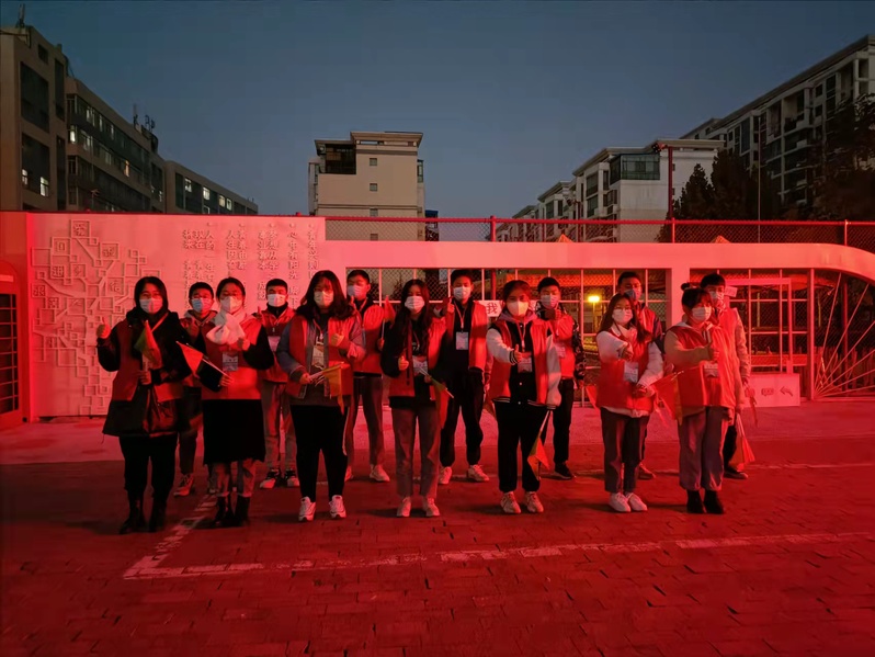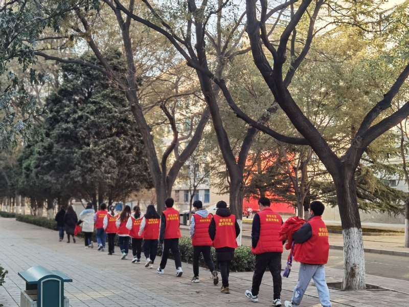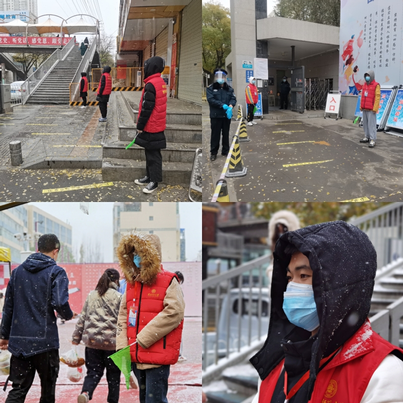 化身志愿红,吹响冲锋号。志愿者们不畏严寒,不辞辛苦,在食堂、公寓、天桥、马路引导同学测体温、亮绿码,有序进出,引导购餐员工按要求持通行卡排队等候,疏散聚集人员,确保食堂就餐有序安全。同时积极配合门卫做好进入人员的登记、查验健康码、测量体温、消杀等工作。