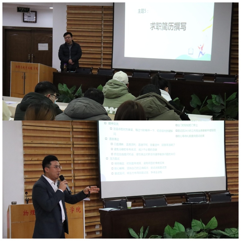 12月11日和12日全天,人才招聘处胡炜老师、体育公司贾志强老师、班主任秦志荣老师在物理与电子工程公司409学术报告厅为公司60名本硕毕业生和其他年级40余名员工开展就业能力培训。