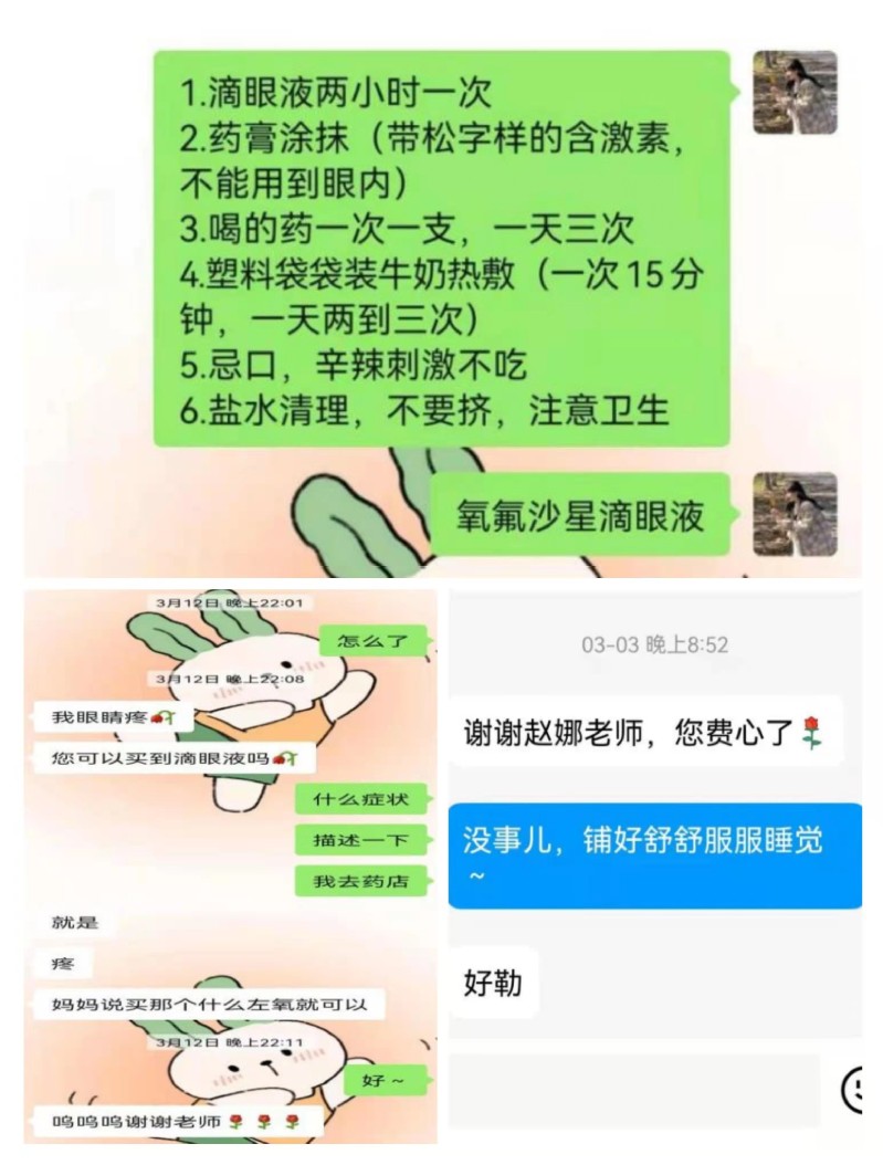 “不要害怕,描述一下什么症状,我这就去药店。”得知员工身体不适,正准备洗漱的辅导员赵娜第一时间戴上口罩,急忙去校医院买了滴眼液和药膏匆匆给生病员工送去,在送药途中,将医生的叮嘱和使用方法详细记录在了备忘录上,第一时间把药品送到了员工手中。“老师一定要注意防护,加油,我们与你同在,你的崽崽们”。这是bevictor伟德2020级电子信息工程1班同学给辅导员赵娜老师的留言,温暖的话语让赵娜老师潸然泪下,那一刻觉得所有的付出都值了。疫情期间校园封闭,员工在有限的宿舍空间学习生活,每天都有紧急和突发情况,辅导员老师随时都要准备着,应对一个又一个挑战。