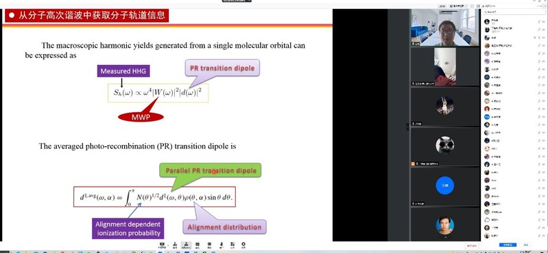 金成教授首先介绍了几种调控阿秒脉冲波形的方案,并将整形所得的单个阿秒脉冲用于调控Fano线型。金成教授还展示了如何在宏观介质层面产生单个阿秒脉冲,并提出从高次谐波条纹光谱中提取单个阿秒脉冲振幅和相位的方案,该方案有望在将来的单个阿秒脉冲的实验测量中得到应用。最后,金成教授还报告了在涡旋飞秒激光驱动下原子高次谐波的最新进展。