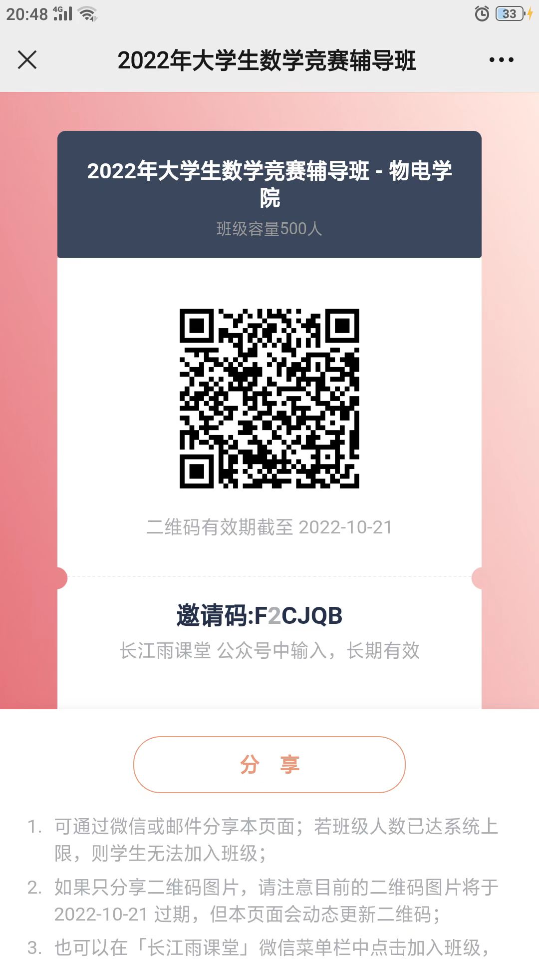 为了方便对参加本届老员工数学竞赛的同学予以及时、适当的赛前辅导,请所有报名参加比赛的同学扫描以下二维码,进入长江雨课堂系统的赛前辅导班级,获得赛前缴费安排、历届竞赛辅导资料、参赛师生合影、赛前考场安排及初赛获奖名单等相关具体竞赛信息。