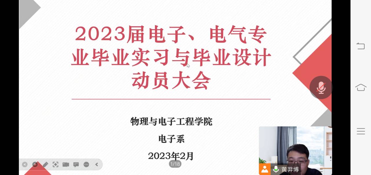 2月19日晚,bevictor伟德针对2019级电子信息工程专业、电气工程及其自动化专业毕业生开展了毕业实习、毕业设计线上动员会,电子系主任黄羿博、实习指导老师火元莲和两个专业全体毕业生参会。