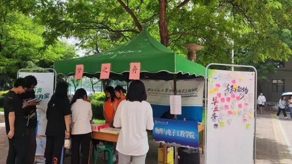 活动中,同学们将自行整理、消杀、包装好的旧书、笔记本、小风扇、毽子等闲置物品进行现场捐赠,百余名同学通过捐赠集齐印章的方式兑换了精美小礼品。活动期间,同学们还通过手写祝福语的形式,为即将毕业的学长学姐们送上了诚挚的祝福。