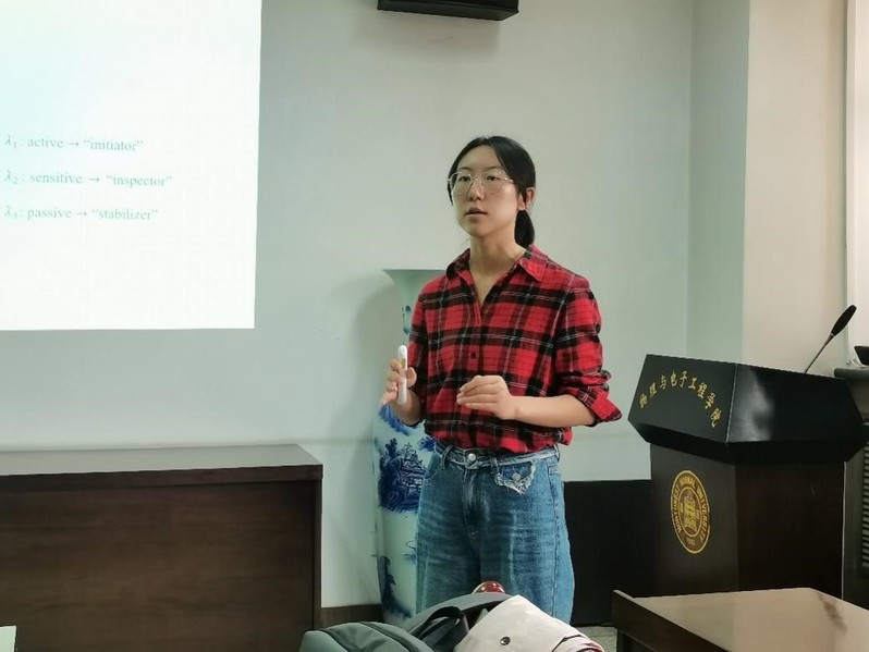 杨贇彤首先介绍了相关工作的大背景,同时对量子拉比模型也做了简单介绍;然后介绍了他们所提出的对哈密顿量连续做两次对角化的新方法。这个方法能够给出系统的能量以及波函数,利用波函数对系统的性质进行描述。进一步他们将这个方法发展成了图案图像。图案是由粒子之间的相互作用导致的粒子的有组织模式,利用这些模式可以对系统的相变过程进行刻画,这是一个刻画相变的新图像。杨贇彤的报告引起了在座师生的广泛兴趣,老师和同学们在报告中和报告后提了各种问题,杨贇彤都一一进行了详细的解答。