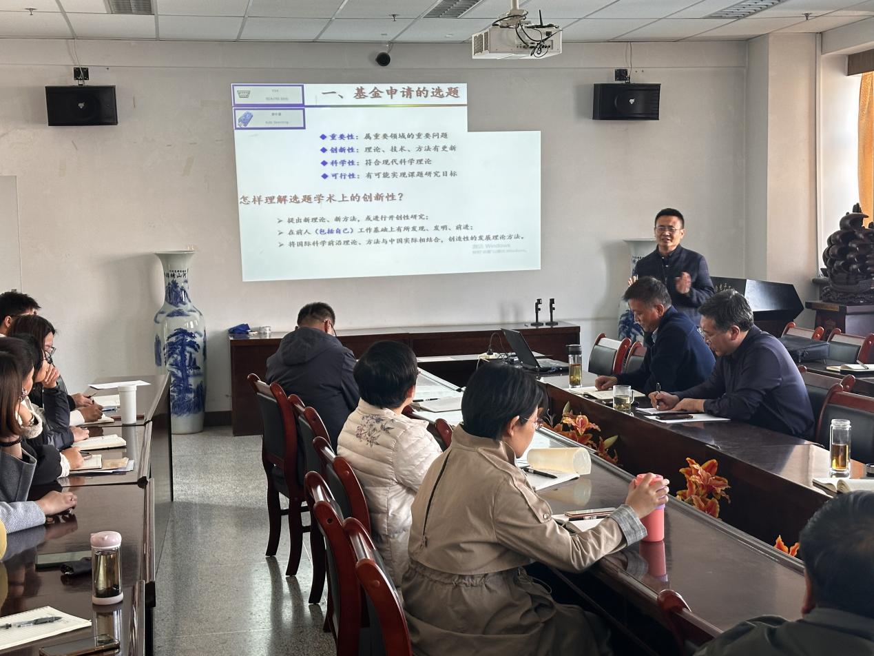蒋军教授立足项目申报书的撰写和研究质量为与会老师作了培训,他从项目选题、申报书撰写、研究基础积累、学术合作与交流等方面分享了自己的经验和心得,并和与会老师就相关问题进行了交流探讨。