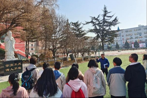 在校门正对的孔子雕像前,王主任介绍了被尊崇为“万古师表”的古代杰出教育家孔子对教师提出的基本要求:“仁且智”,他所体现的“学而不厌,诲人不倦”的教学精神,是古代中国对于教育者人格境界和师表风范的最高追求,已成为中国教师的优良传统,直到今天仍然影响着中国的千万教师。