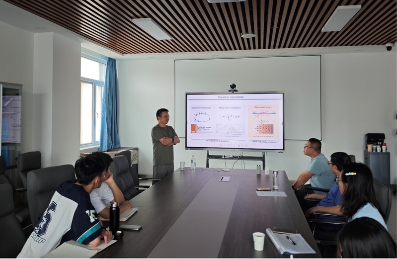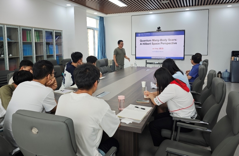 26日下午,应磊教授作了题为“Quantum Many-Body Scars: A Hilbert Space Perspective”的学术报告。应磊教授首先从量子-经典对应的视角介绍了平衡态、热态、疤痕态等基本概念,回顾了量子疤痕研究从上世纪80年代单粒子时代到近年来多体量子疤痕研究的发展。随后,重点介绍了课题组基于hard-core Bose-Hubbard 模型提出的全新的量子疤痕态及其产生机理,这是量子多体疤痕在非约束系统中的首次实现。最后,应磊教授详细介绍了量子多体疤痕在超导量子平台中的实验实现,及其在量子信息与精密测量等方面的潜在应用,并对报告内容作了简要总结与展望。