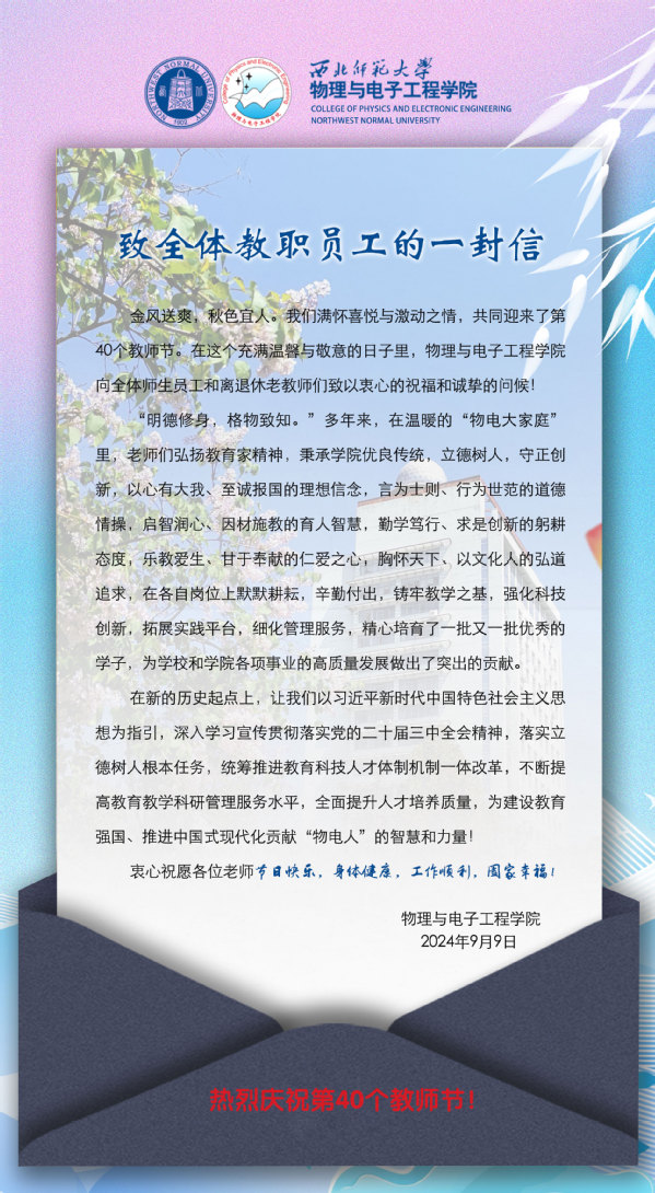 教师节期间,物电公司各系所中心、师生党支部、班级团支部结合学科专业特色,通过开展座谈会、制作主题展板、呈送感谢信等多种方式,将教师节庆祝活动和加强师德师风建设相结合,开展了一系列丰富多彩的主题党日和主题团日活动,向辛勤耕耘在教育一线的老师们致以最崇高的敬意和最诚挚的祝福。
