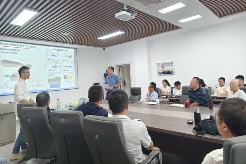 朱兴龙研究员主要介绍了超短超强激光脉冲在相对论非线性光学、高强场物理、激光聚变、实验室天体物理等前沿领域中的重要应用,针对目前国际上所能实现的最高功率(十拍瓦级)强激光与物质相互作用的极端情况及其产生的新物理效应和作用机制进行了重点讲解。特别是,他们发现了拍瓦级超强激光与近临界密度等离子体锥靶作用激发的非线性多光子过程,显著降低了电子辐射捕获条件,并提出了国际同行高度认可的稠密正电子的高效产生方案。在GeV伽马射线方面,他们提出了通过两级不同密度等离子体实现高效电子加速和高能辐射的新方案。在中红外脉冲方面,研究发现了强激光驱动非线性尾波可以快速诱导光频率转换并产生高效的相对论单周期中红外脉冲。在报告讨论环节,朱兴龙研究员同公司师生就科学研究、合作交流、人才培养等方面的问题进行了深入交流。