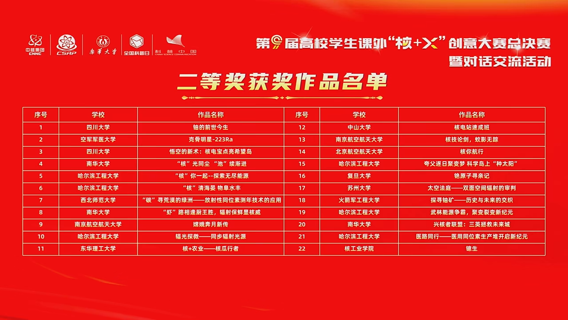 10月12日,由中国辐射防护学会发起,中国核工业集团有限公司主办,南华大学、中国辐射防护研究院承办的第九届高校员工课外“核+X”创意大赛总决赛暨对话交流活动在南华大学举行。百余所高校征集的1352件作品参赛,经过高校选拔赛、区域赛、全国初赛及半决赛的层层角逐,评选出前三等奖作品80件,决赛现场评选出一等奖作品5件、二等奖作品22件。