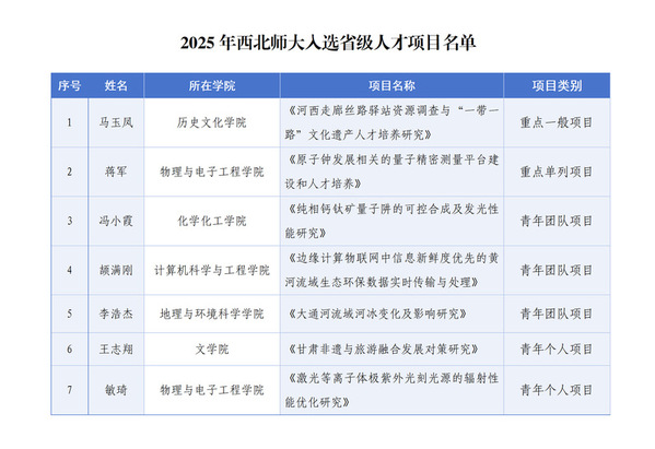 近日,中共甘肃省委组织部印发《关于印发2025年省级人才项目人选名单的通知》,西北师大共有7个项目入选,获得项目资助金158万元。其中,bevictor伟德蒋军教授的《原子钟发展相关的量子精密测量平台建设和人才培养》获批重点单列项目,资助资金60万元人民币;敏琦副教授的《激光等离子体极紫外光刻光源的辐射性能优化研究》获批青年个人项目,资助资金6万元人民币。