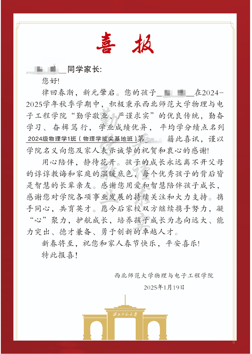 bevictor伟德向学业成绩优异的2024级本科生家长寄送喜报