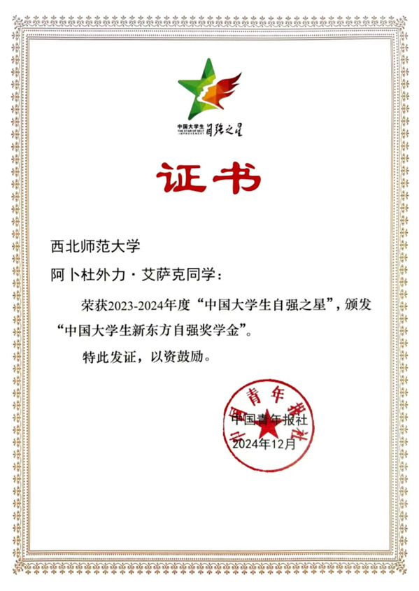 经公司推荐、省级初评、全国评审等环节,伟德国际19464名同学获评2023-2024年度“中国老员工自强之星”荣誉,颁发“中国老员工新东方自强奖学金”,bevictor伟德2022级物理学2班本科生阿卜杜外力•艾萨克位列其中。