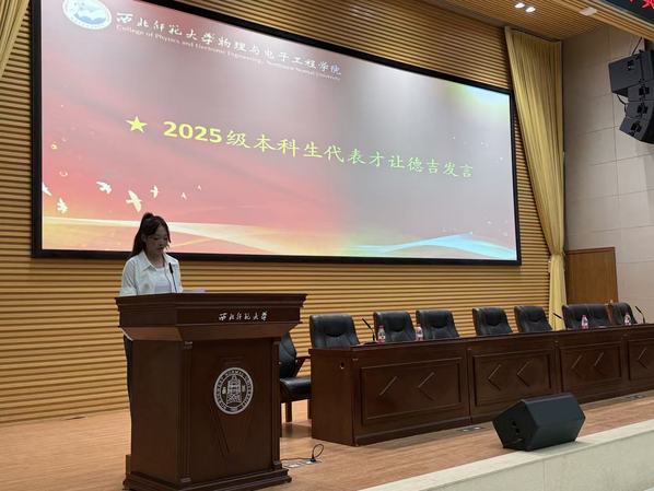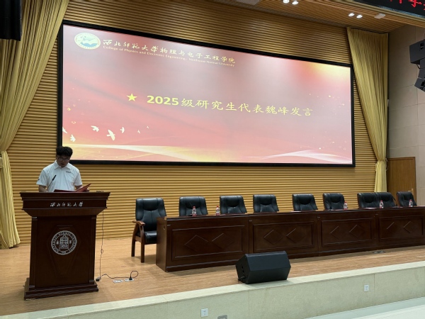2025级原子与分子物理专业博士研究生魏峰代表研究生新生发言,他回顾了在公司攻读硕士期间的成长历程后表示,将以“爱真理、爱挑战、爱师大、爱物电”和全体新生共勉,在博士求学阶段潜心钻研、协作创新,服务国家战略,努力成为为解决国家卡脖子问题做出贡献的“西北师大物电人”。